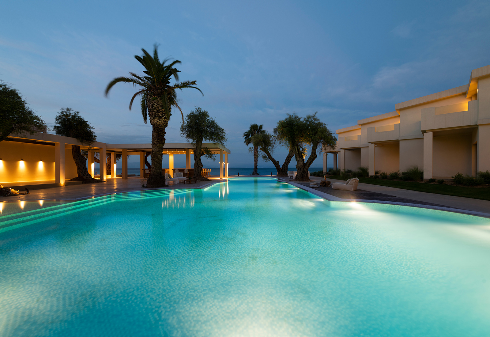 Rommenes vakre tregulv fører helt ut til balkong/terrasse med utsikt over hagen eller havet. På kveldene kan du slappe av med ditt eget hjemmekinoanlegg. Bestiller du en suite får du et privat basseng og et automatisert glasstak slik at du kan få selskap av stjernene – innendørs.